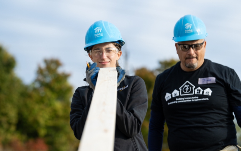 Volunteers remain at the heart of these builds, including Whirlpool employees, Monroe County Habitat for Humanity volunteers, and students from IU’s Kelley School of Business. Beyond construction, Whirlpool is also investing in workforce development by engaging IU students through professional development opportunities and hands-on building experiences.