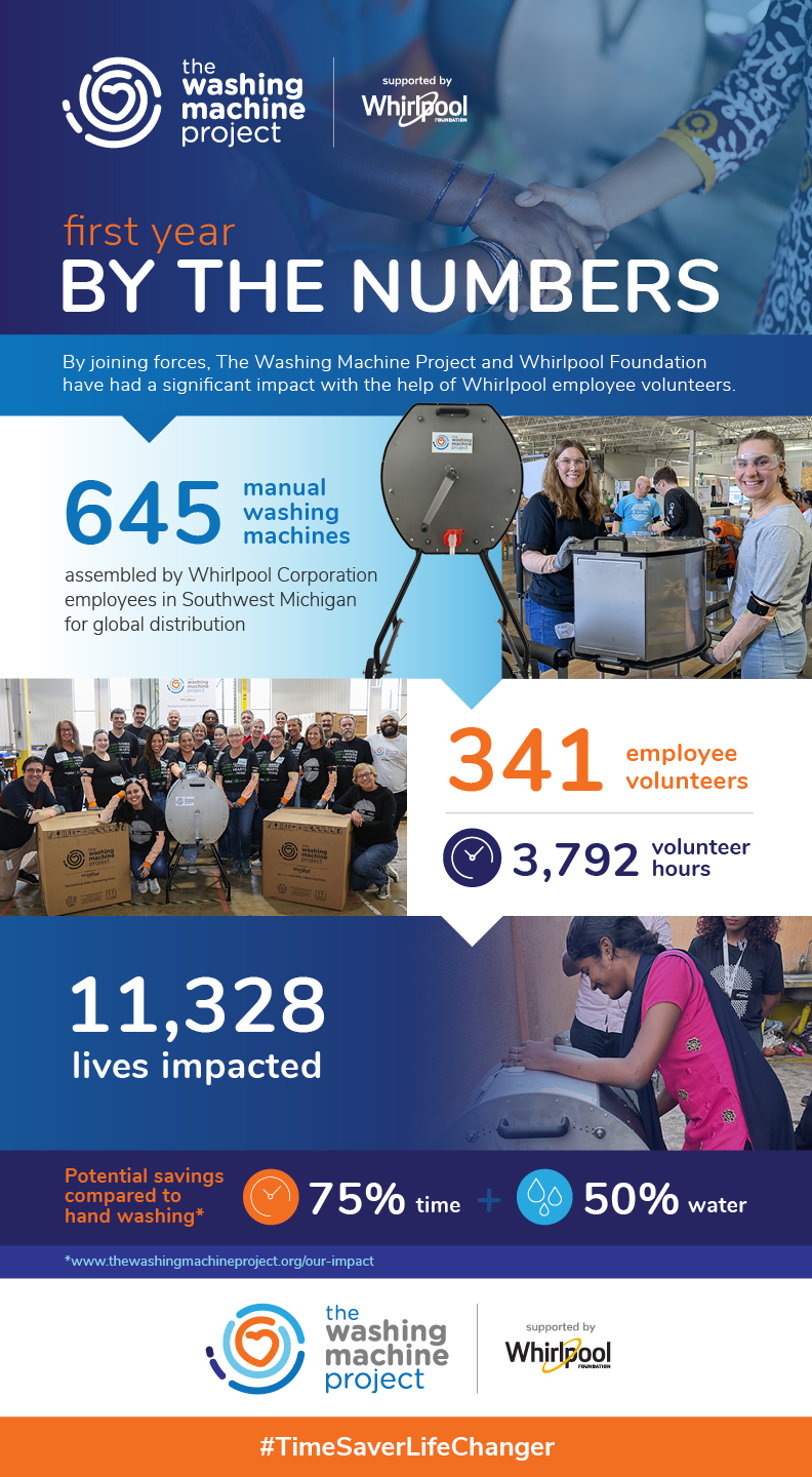 In the past year, 340 Whirlpool employee volunteers donated nearly 4,000 hours to build 645 manual washing machines using a manual assembly line thoughtfully developed by company volunteers. Whirlpool employees also participated in “Washout” events, where they were able to experience how grueling it can be to hand wash clothes, helping them build empathy with the majority of the global population who have no alternative but to do their laundry by hand. The Washing Machine Project and Whirlpool have distributed these machines to communities in India, Mexico, the Republic of Congo and Ghana - impacting over 11,000 lives and counting.
